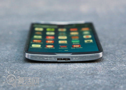 Galaxy Round的弯曲程度比大部分人所看到得要更加优雅。背面朝下将设备放置在桌面时,如众人所想能够做跷跷板运动。拿在手上或是打电话贴近耳朵和脸部,都会感觉这样的弧度相当符合人体工学,似乎就是为人体的结构打造的,远比冷冰冰的直板设备要温婉柔和。