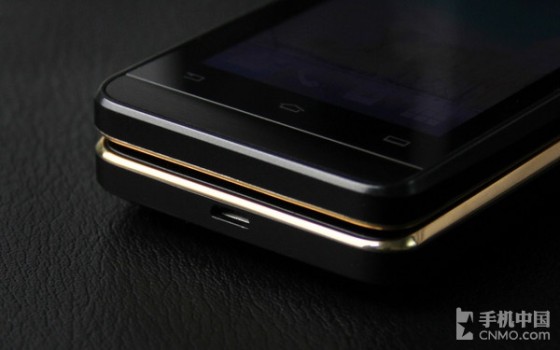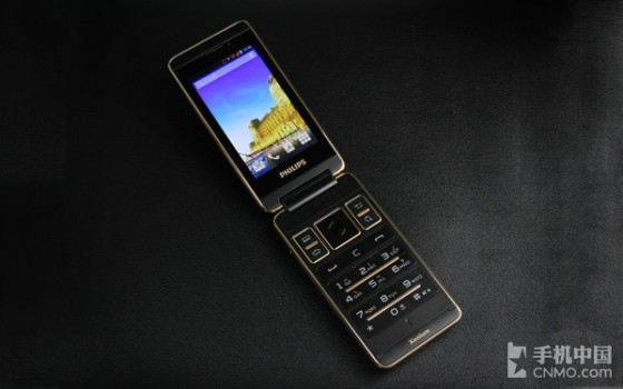 在打开飞利浦W9588的翻盖之前,可以将其当做一个普通直板触屏手机一样进行相关操作,而且该机的外在设计也与直板手机较为相似。不过,打开翻盖之后,则可以看到这款奢华翻盖手机的真容,如下图所示,经典黑+“土豪金”的颜色搭配,显得高端奢华,再度彰显了飞利浦W9588的尊贵风范。