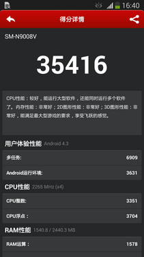 三星GALAXY Note3 LTE版延续着Note3的顶级配置,配有5.7英寸1080p屏幕、2.3GHz骁龙800四核处理器和3GB RAM,关于配置方面的信息想必大家都已经很熟悉了。高达35416分的跑分成绩,在目前Android阵营中依然是顶级的性能,从而为用户的体验打下了良好基础。