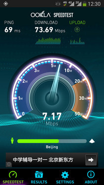 不过就4G的体验来说,网络浏览速度有了质的飞跃,当然了这是相对于中国移动之前的3G网络而言。我们用测速软件进行测试,在信号稳定的情况下4G网络的下行速度最高达到了73.69Mbps,而上行速度最高则是8.52Mbps,当然这还并不是4G网络的峰值。