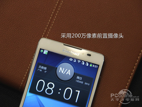 听筒右侧为200万像素的前置摄像头以及光线/距离感应器,酷派的品牌Logo在中间的位置。