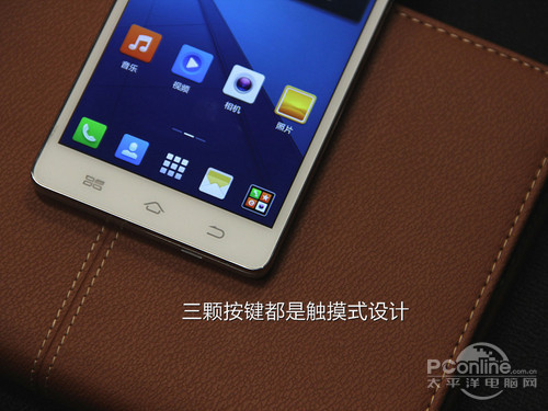 屏幕下方设有三个常规按键,都为触摸式设计。菜单键和返回键分居Home键两侧,带有自发光效果。