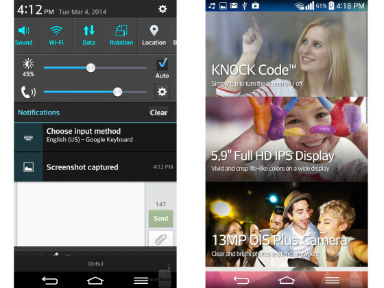 LG G Pro 2采用的是最新的Andriod 4.4操作系统,配有LG传统的使用界面。相对来说,此版本的UI用户可选择性比较多,每一个应用图标、屏幕下方的虚拟按键都可以让用户自由选择。另外,下拉菜单中也同样拥有丰富的选项,网络连接、亮度、音量等等。