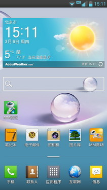 至于手机桌面以及应用程序列表界面,LG E985T则依旧延续了Android手机的传统设计,分别属于两个不同的界面,没有进行融合。另外,需要指出的是,LG E985T应用列表界面采用循环式设计,用户向左或是向右滑动,则可以在原有的几个应用列表界面之间进行循环切换,较为人性化。