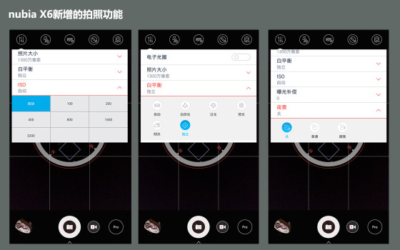 当然了,作为一款主打拍照的手机系列,nubia X6的新UI也新增了不少拍照功能,其中除了核心的三大独立(独立测光、独立对焦、独立白平衡)之外,该机还加入了电子光圈、Fun模式下的星轨和光绘以及偏光滤镜等等功能。