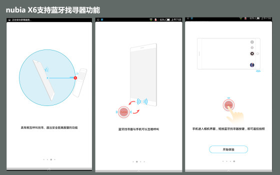 关注nubia X6发布会的朋友应该知道,这款手机还有三个非常实用的配件。除皮套之外,那两个蓝牙设备均有相对应的程序。图为蓝牙找寻器功能界面。