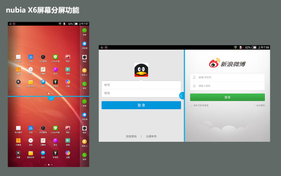 作为一个大屏手机革命性的的功能,屏幕分屏操作一直是这个手机市场研究的课题。此次nubia X6上也加入了这个功能,并且实际使用起来非常的方便,任意两款应用程序均可以分屏运行,并且分屏比例还可以自由调节。