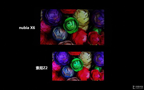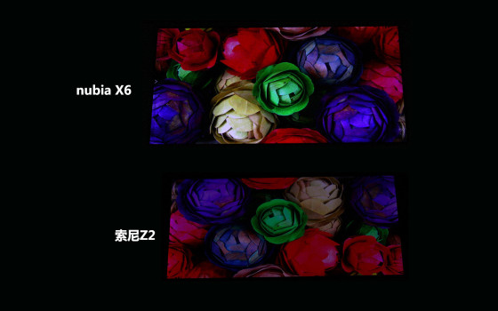 为了更好的看出效果,我们选取目前人气顶配旗舰索尼Z2作为参照手机。首先我们看一下nubia X6屏幕的色彩度,从图中我们可以看到,在默认情况下,nubia X6屏幕的色彩度相较索尼Z2而言屏幕整体色彩还原度更高。