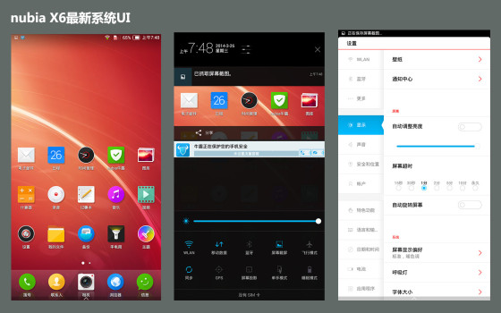 可以说,除了硬件之外,nubia X6最大的改进就在于它的系统UI,此次升级的nubia UI 2.0新增很多人性化的功能,它让我们使用手机更加的方便。首先在系统UI界面,nubia UI 2.0主要采用圆形和方形图标设计,不同性质图标代表着不同类型的应用,并且界面更加的扁平化。