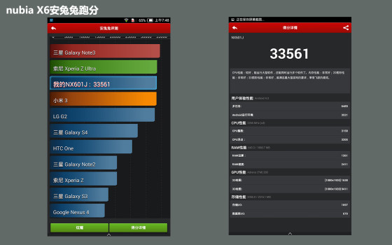 相信喜欢研究手机的朋友都知道安兔兔评测这款软件,它通过基准跑分,来得出这款手机各个方面的性能指数,从而总结出一个总体得分,用户可以用个这个 跑分数据来衡量这款手机处于何种水平。从最新安兔兔性能测试v4.3的成绩来看,nubia X6的表现绝对称得上是旗舰级,33561分的成绩也是最顶级的表现。