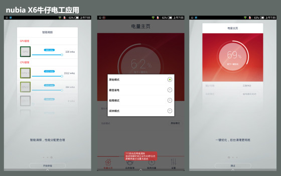 nubia X6还保留了非常实用的牛仔电工这个应用,我们可以在对大限度智能节电的同时,还能够完成诸如一键优化、智能调频等高级功能。