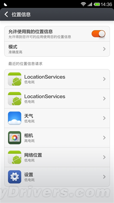 Android 4.4加入了低功耗音频和定位模式,可以进一步减少设备的功耗。在4.4版本的MIUI V5中,位置信息使用权也改名为“位置信息”,对三种定位模式的解释更加准确,使用户可以清楚的根据自己的需求选择不同的定位模式。而且在位置信息界面, 可以清楚的看到哪些应用最近使用了定位,功耗如何,一目了然非常方便。