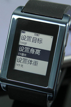它采用的是1.25英寸夏普半反半透屏,分辨率为144×128像素,具有黑白高对比度显示效果,对于手表内支持的功能来说,这块屏幕显示的还是相当不错的。另外该屏幕的最大特点就是相当省电,充满电后可待机8天,相当好的解决了智能穿戴设备的待机问题。