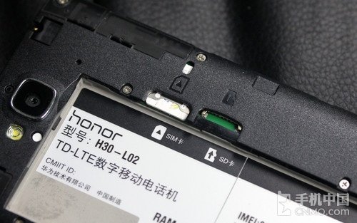 打开后盖,4G版机型仅为单卡设计,支持中国移动的TD-LTE网络,向下兼容TD-SCDMA和GSM网络(国内网络),其它方面没有变化,包括支持MicroSD卡扩展、可拆卸的2300mAh电池。