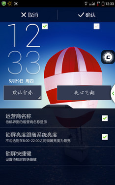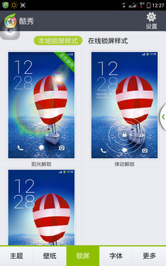 锁屏界面三个快捷方式使用起来很方便,同时这三个按键可支持自定义,满足不同用户的使用习惯。锁屏状态下解锁时带有光晕效果,通过全局美化软件酷秀可以对主题、壁纸、解锁样式等进行更改,种类很多。