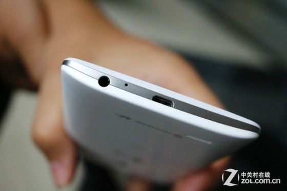 由于主要按键都位于机身背部,因此LG G3的边框也就显得十分干净。机身顶部可以看到一个红外发射装置,机身底部是耳机插孔和USB接口,机身两侧则很干净没有任何按键。
