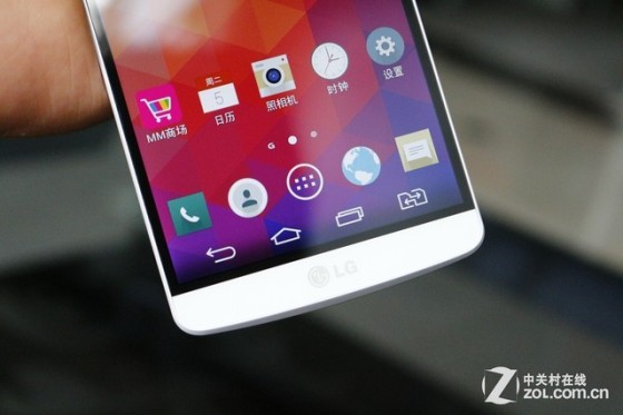 LG G3 配备了一块5.5英寸的屏幕,分辨率则是目前智能手机行业的顶级水平:2560*1440,颗粒感这东西在这块屏幕上是不适用的。虚拟按键整合在屏幕内因 此显得LG G3的屏占比够大。屏幕上方依旧是听筒设计,右侧是中国移动4G标识,左侧是一枚200万像素的前置摄像头,摄像头的位置并不明显,不破坏精 致的设计感。
