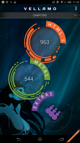Vellamo是由Qualcomm(高通公司)开发的一个基准测试应用(类似于Neocore),它可以让你对手机浏览器的性能及稳定性进行 测试,包括像Java脚本性能、渲染、联网和用户界面等。该工具的结果同样包括多个子项,但我们只取总成绩,分数越高则表明手机对浏览器的优化程度越高, 网页浏览体验更好。
