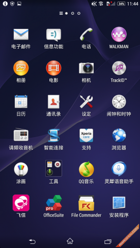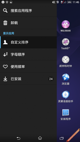 在二级应用菜单界面下,则是显示手机中全部的应用。同时索尼还系统了显示应用排序,用户可通过字母顺序或者使用频率等自由将二级应用菜单下的应用图标进行排序。