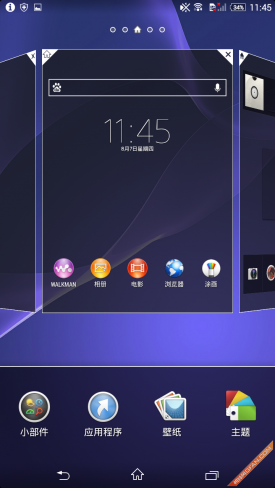 系统桌面采用两层式布局,在桌面上用户可以自由添加常用应用图标之外,还可以添加小工具,以方便用户使用手机。