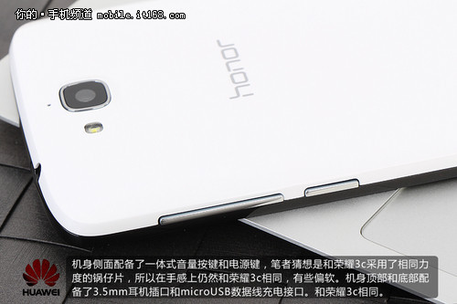机身侧面配备了一体式音量按键和电源键,笔者猜想是和荣耀3c采用了相同力度的锅仔片,所以在手感上仍然和荣耀3c相同,有些偏软。机身顶部和底部配备 了3.5mm耳机插口和microUSB数据线充电接口。和荣耀3c相同。但可以看出插口的位置已经发生改变,华为荣耀3c畅玩版内部模具已经和前作完全 不同了。