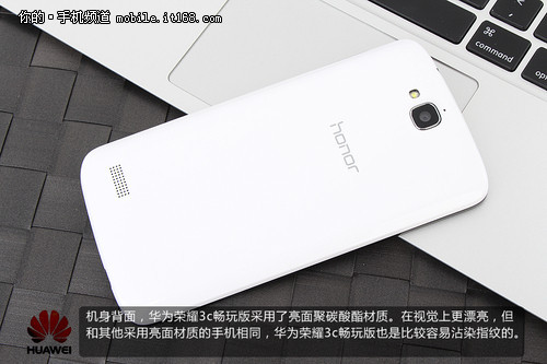 机身背面,华为荣耀3c畅玩版采用了亮面聚碳酸酯材质。在视觉上更漂亮,但和其他采用亮面材质的手机相同,华为荣耀3c畅玩版也是比较容易沾染指纹的。