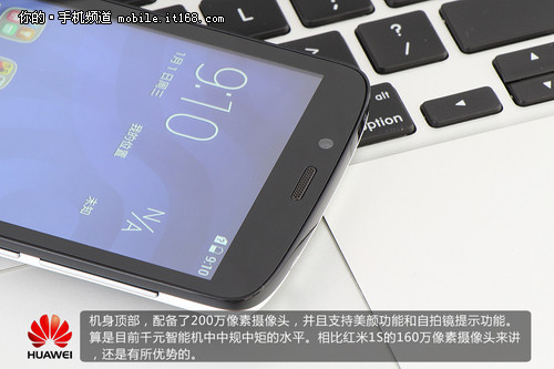 机身顶部,配备了200万像素摄像头,并且支持美颜功能和自拍镜提示功能。算是目前千元智能机中中规中矩的水平。相比红米1S的160万像素摄像头来讲,还是有所优势的。