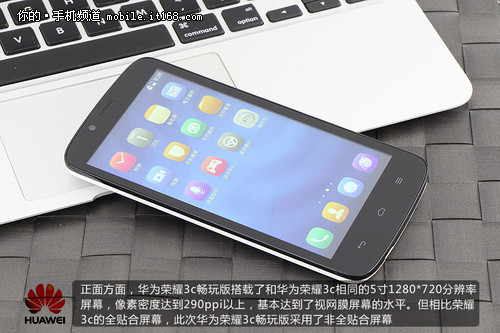 正面方面,华为荣耀3c畅玩版搭载了和华为荣耀3c相同的5寸1280*720分辨率屏幕,像素密度达到290ppi以上,基本达到了视网膜屏幕的水 平。但相比荣耀3c的全贴合屏幕,此次华为荣耀3c畅玩版采用了非全贴合屏幕,其实采用非全贴合屏幕主要出于两点考虑,第一点就是成本问题,对于一款售价 599元的手机来讲,厂商对于成本还是十分敏感的。第二点就在于考虑到全贴合屏幕的安全问题,碎屏后保修成本过大。