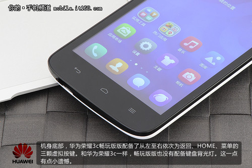 机身底部,华为荣耀3c畅玩版版配备了从左至右依次为返回、HOME、菜单的三颗虚拟按键。和华为荣耀3c一样,畅玩版版也没有配备键盘背光灯。这一点有点小遗憾。正面方面就可以看出华为荣耀3c畅玩版采用了更大的圆角设计。和前作完全不同。
