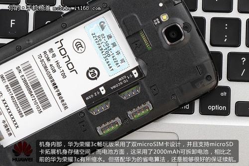 机身内部,华为荣耀3c畅玩版采用了双microSIM卡设计,并且支持microSD卡拓展机身存储空间,而电池方面,这采用了2000mAh可拆卸电池,相比之前的华为荣耀3c有所缩水。但搭配华为的省电算法,还是能够很好的保证续航。