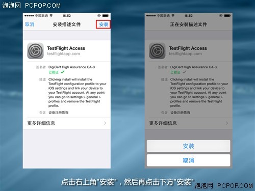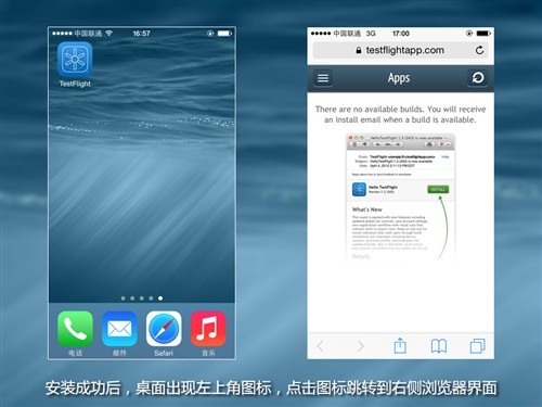 这个地方需要注意一下,点击桌面新增的 TestFight 图标,可能会跳转到上图右侧的界面。不用担心,这是因为您当前的 iOS 设备刚刚连接上该网站,需要等到一小会。一般不会超过半小时,我在安装的时候大概等了10分钟就可以了。重新刷新即可,大家就能看到下图的界面了。
