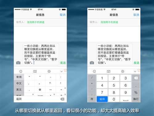 人们在切换中英文、数字、符号等功能,习惯性是点击哪里就再从哪里切换回来,但苹果的理念是你用什么键盘,就点击什么键盘。比如苹果将数字放在 键盘左侧中间,但如果数字输入完毕之后,却要点击左侧靠下的“拼音”,这就导致人的手指要不断的切换上下甚至左右不同的位置。至少我个人用了一年,还没有 完全适应,每次都要去看、或者去想两个到底切换按钮在哪里。