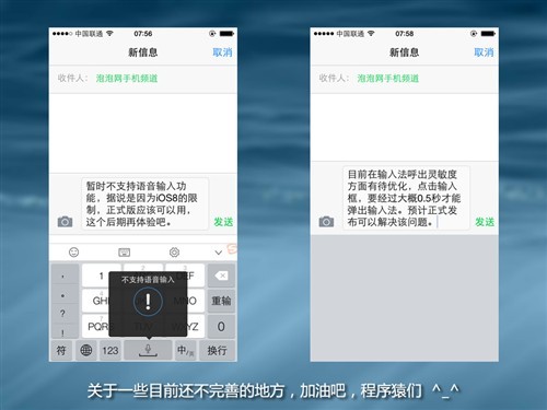 目前的iOS8和搜狗输入法,严格意义上来讲都属于半成品,比如由于测试版系统的限制,导致输入法无法开启语音输入,这点暂时不能体验。但仅从 开发版就能感觉到搜狗在输入法方面深厚的实力,确实能让你的手机更加好用。如果一切按照传闻所说,美国时间9月9日,苹果就会正式发布iPhone6,届 时iOS8正式版也会一同而至,更多目前限制的功能也会开放,这样更有利于第三方软件的发展,届时呼出延迟的问题也肯定可以解决。