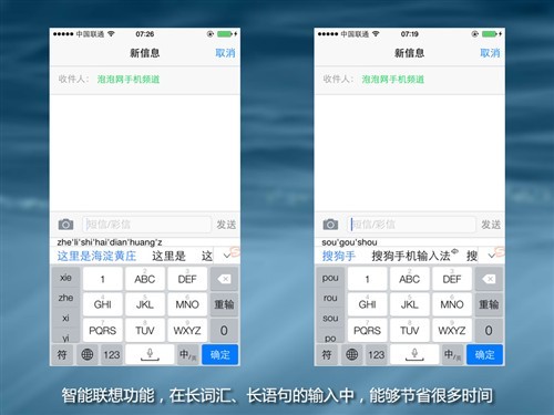 智能纠错和智能联想功能,是第三方输入法拼命优化的重要功能,这点苹果原生输入法做的比较差,尤其是在输入一些不是很知名的地名、社会热门词汇 的时候,苹果输入法会让你非常抓狂(不过它对人名和通讯录的支持是很赞的)。而搜狗在这方面一直做的非常优秀,这应该得益于其早年间在电脑端的优势,成功 “干掉”了“智能ABC”这个根本不够智能的中文输入法。