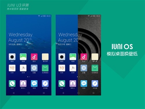 模拟桌面更换壁纸十分人性化,IUNI OS将这项功能做得更为简单,比MIUI同样的功能操作更加简单上手。而且更换壁纸的效果也很出色。
