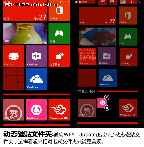 微软在WP8.1Update上面还推出了全新的动态磁贴文件夹。我们都知道WP平台界面的亮点就是动态磁贴图标,这也是提供微软、诺基亚品牌辨识度的标志。那么动态磁贴不能动就是不完美的事情。本次微软在WP8.1Update上面升级了文件夹,将动态磁贴放了文件加里并且可动。这此更新也是让许多WP用户称赞的亮点之一。