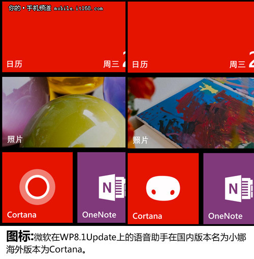微软在WP8.1Update分为海外版和国内版,为了给用户一个良好的体验,微软在中文版Cortana上面进行了全本土化研发,所以图标也有所不同。其实中国版Cortana研发已经有一年时间,具体的开发工作大部分是由中国本土(微软亚太研究中心)的开发团队完成的,小娜的开发差不多是跟美国同时进行的,通过更完善的本土语音服务我们可以看出微软在小娜方面还是十分重视中国市场。