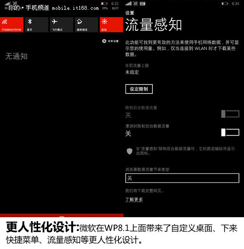 其实在WP8.1上面也做了许多优化,例如在任何界面的屏幕,顶部下拉即可显示操作中心,操作中心是两段式下拉:快捷设置按钮和通知中心。面对庞大的安卓与苹果用户群的下拉通知栏这一习惯,这一次的WP站在了用户的角度做出了妥协。