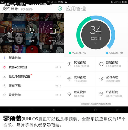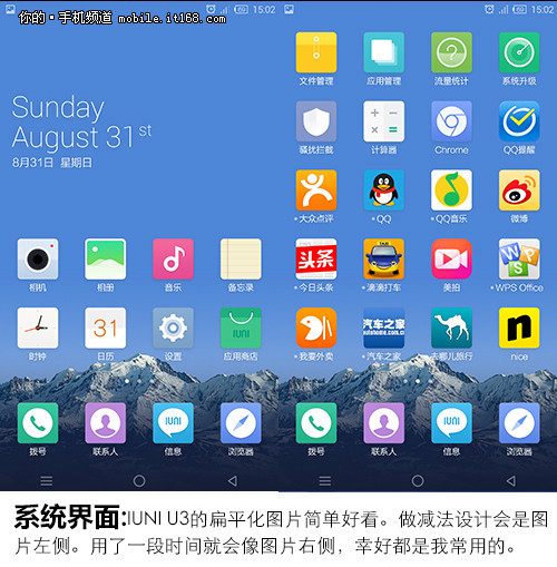 关于智能手机系统,目前只有安卓、WP8以及标杆的iOS三大平台。安卓平台被广泛使用,其OS也是多种多样。最具代表的一定是小米的MIUI、魅族的Flyme、三星TouchWiz、HTC的Sense以及主角的IUNI OS。随着智能手机的高速发展,OS也预装了许多常用软件,这些软件对于有需求的用户很方便,但对于没需求的用户来说难免有些多余,所以IUNI OS采用零预装。