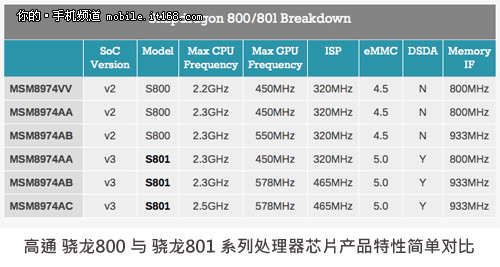 通过对比图片,我们可以看到,IUNI U3搭载的是最新的MSM8974AA处理器,相比其他高同MSM8974系列处理器,在CPU主频、GPU主频、ISP主频、eMMC版本、DSDA支持和Memory IF上都有差别。简单来讲代在各方面都与常见的MSM8974AC的能力略差。但在日常生活中我们体验不到他们当中的差异。接下来我们就简单解读一下骁龙801处理器性能方面提升究竟有那些。