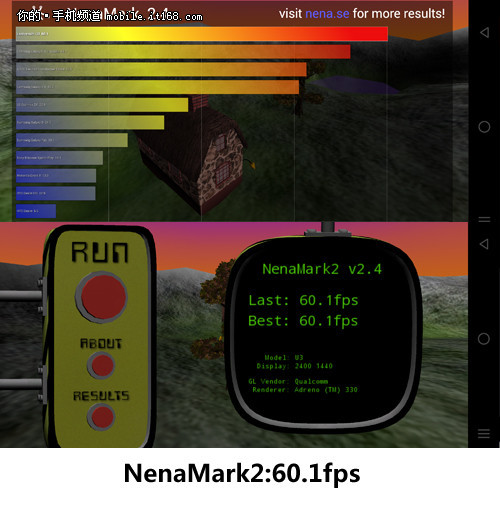 NenaMark2则是一款用于Android设备的硬件加速基准测试程序,通过演示一款实时渲染的画面来对手机的图形能力进行测试,包括反射、动态阴影、曲面参数、复杂光线模式等内容。通过测试的结果,我们可以看到,由于CPU架构和主频的提升,同样带动GPU成绩提高,IUNI U3在Nenamark2上的得分为60.1.9fps的满分成绩。