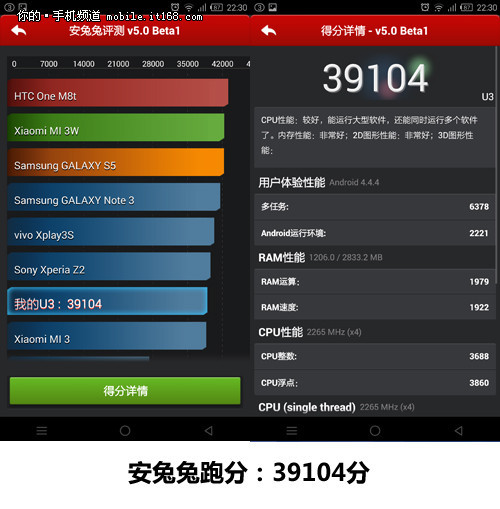 安兔兔是我们常见的一个跑分软件,IUNI U3采用了高通801处理芯片,在安兔兔上跑分为39104分。接近4万分的好成绩也让它加入了旗舰机型家族。很多朋友一会问IUNI U3与上面几款搭载高通801处理器在安兔兔上为什么会有差距?其实UNI U3搭载的是最新的MSM8974AA处理器。