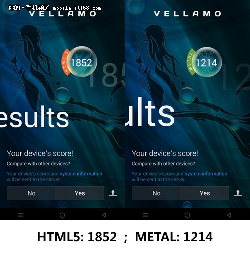 接下来,我们通过其他跑分软件进行一下测试。Vellamo是一款著名的浏览器测试软件,测试的主要方面包括JavaScript、HTML5等性能,这些性能对于手机浏览器等体验有很大的影响,同时也非常考研处理器的运算能力,一定程度上反应了软硬件的综合能力。而在Vellamo的HTML5测试项中可以看到,在HTML5测试中,IUNI U3得到了1852和1214的分数。