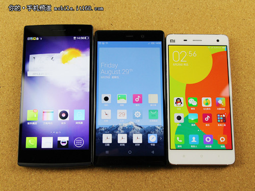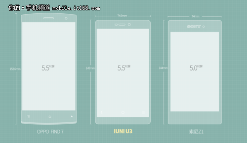 通过上图我们可以明显看到OPPO Find7、IUNI U3以及小米4,IUNI U3与OPPO Find7同样采用5.5英寸2K屏幕,但机身尺寸却小了不少。这样设计的好处一来可以增加产品的美观图;二来可以减少机尺寸,使得用户更方便操作大屏手机。当然,这样绝非IUNI一家采用这样的设计,例如前不久上市的LG G3也同样是这样的设计,未来索尼Z3、魅族MX4等等机器都将会采用这样的设计。