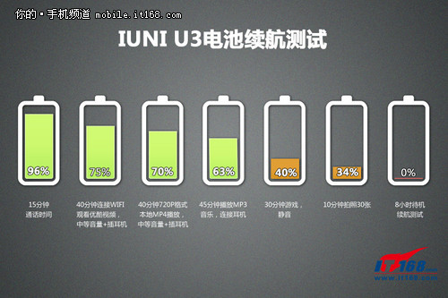 IUNI采用可拆卸电池的设计,配备了一块3000mAh毫安时的锂电池。虽然不可拆卸,还是可以满足用户的日常需求。为了更好的模拟实际使用情况,笔者跟踪记录了中度使用IUNI U3的电池使用情况。其中包括通话、WIFI观看视频、本地视频播放、本地MP3音频播放、游戏以及拍照和充电效果的测试。PS:这个电池续航测试也是IT168手机频道的电池续航标准测试,你可以参考其他机型进行对比。