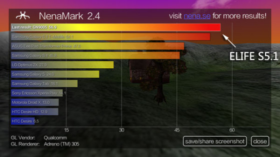 在老牌图形测试软件NenaMark1,ELIFE S5.1均取得了非常接近60fps的优秀成绩,而在NenaMark 2.4当中也超过56fps,说明了Adreno 305 GPU性能良好,满足一般用户对性能的需要,玩玩热门小游戏或看高清电影更是不在话下。