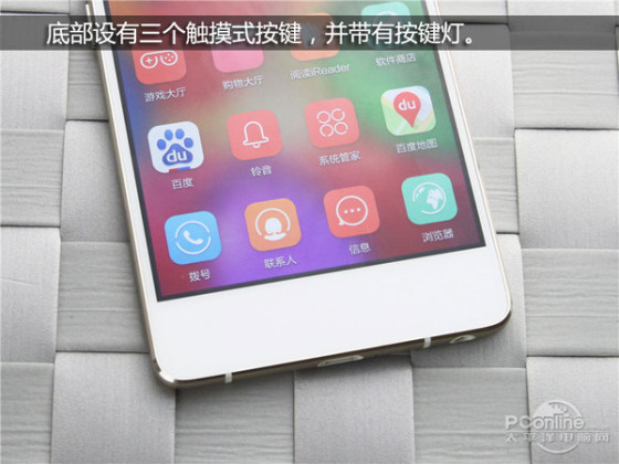 ELIFE S5.1正面底部面板隐藏着三个菜单键,主页键与返回键这三个触摸式按键,按键灯只有在按键被使用时才会触发点亮,按键的颜色较浅,可以达到近乎隐藏的效果,显得机身更具整体性。