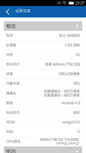 在硬件配置方面,作为千元机级别的ELIFE S5.1不算顶级,但也是不错的,采用了千元机当中常见的高通骁龙400四核平台,主频为1.2GHz。手机的RAM为千元机主流的1GB,而ROM为16GB,遗憾的是不支持存储卡扩展。