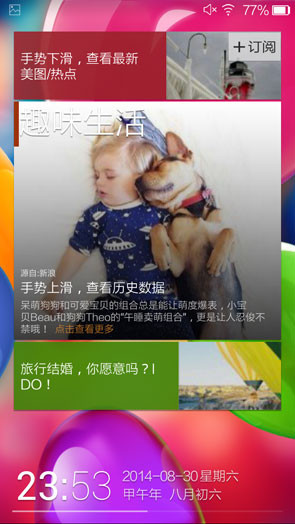 在解锁界面当中,有类似于Flipboard的阅读器,功能也与HTC的Blink Feed相似,用户可以在解锁界面左滑后通过翻页查看资讯,点击设置还可以订阅不同类型的资讯。