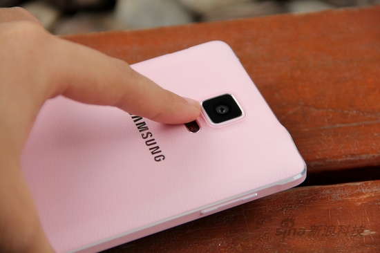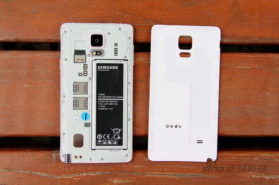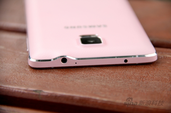 Note 4的背部依旧是仿皮革纹理塑料材质,不过去掉了一圈缝线,毕竟中框上斜角切割后的金属已经形成了一个亮圈。